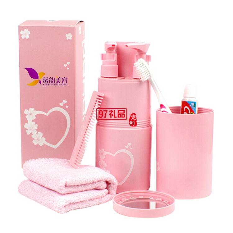 配置:洗發水瓶+沐浴乳瓶+洗漱杯+梳子+鏡子+高露潔牙膏40g+竹纖維毛巾+牙刷