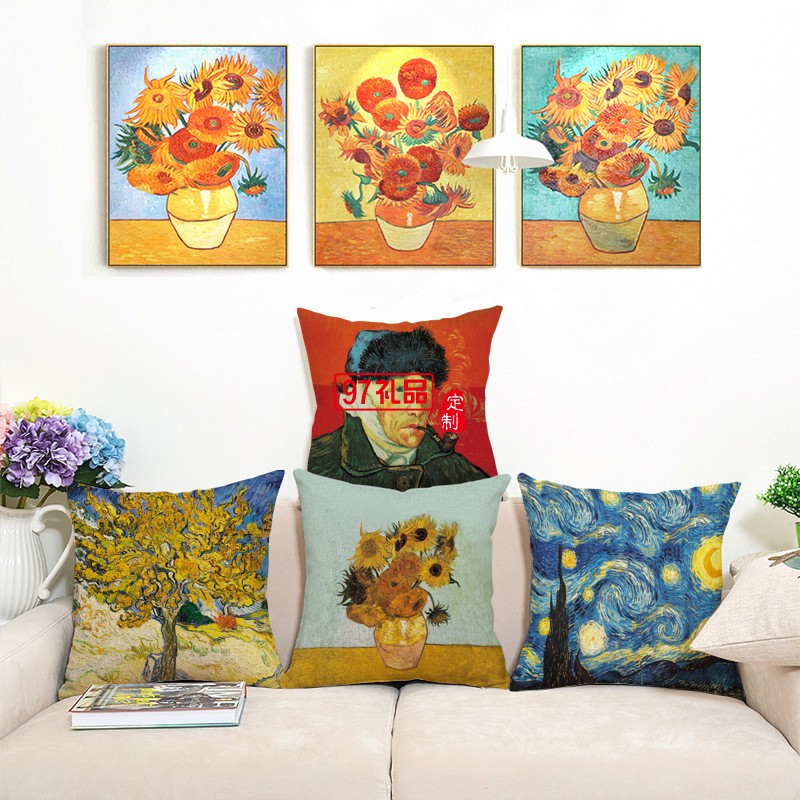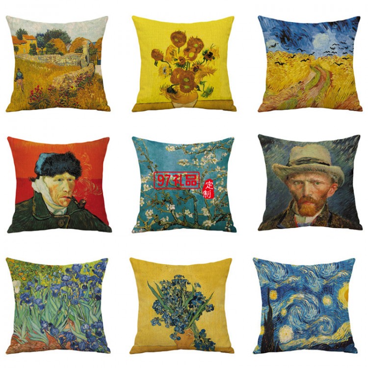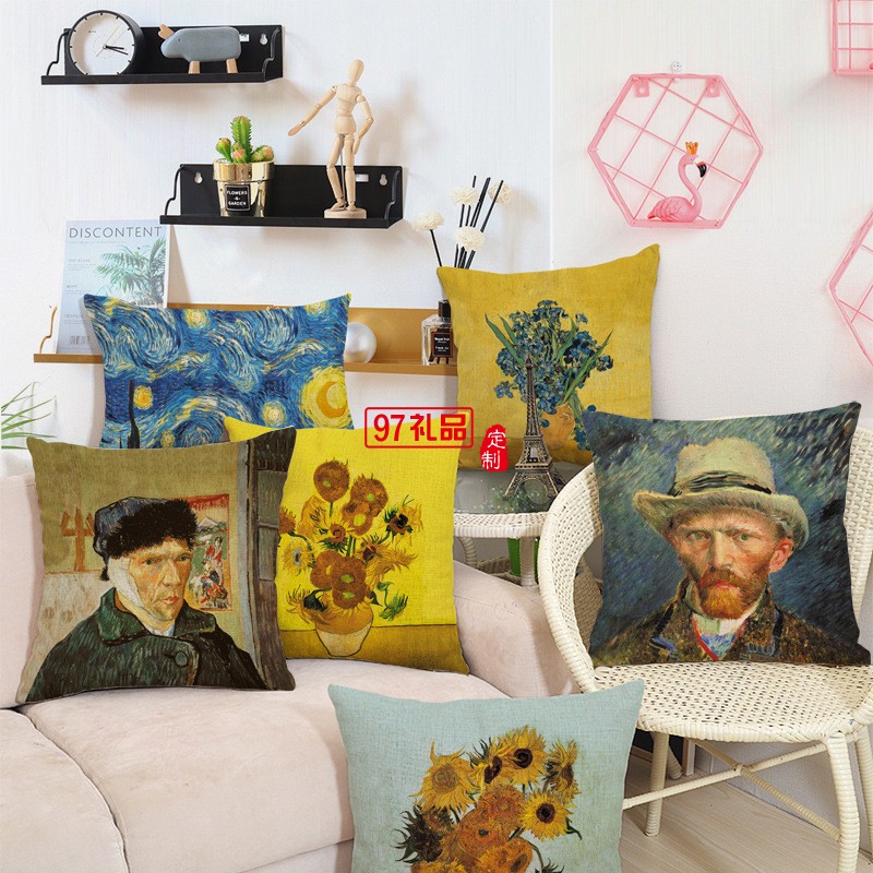 創意梵高油畫印花棉麻抱枕