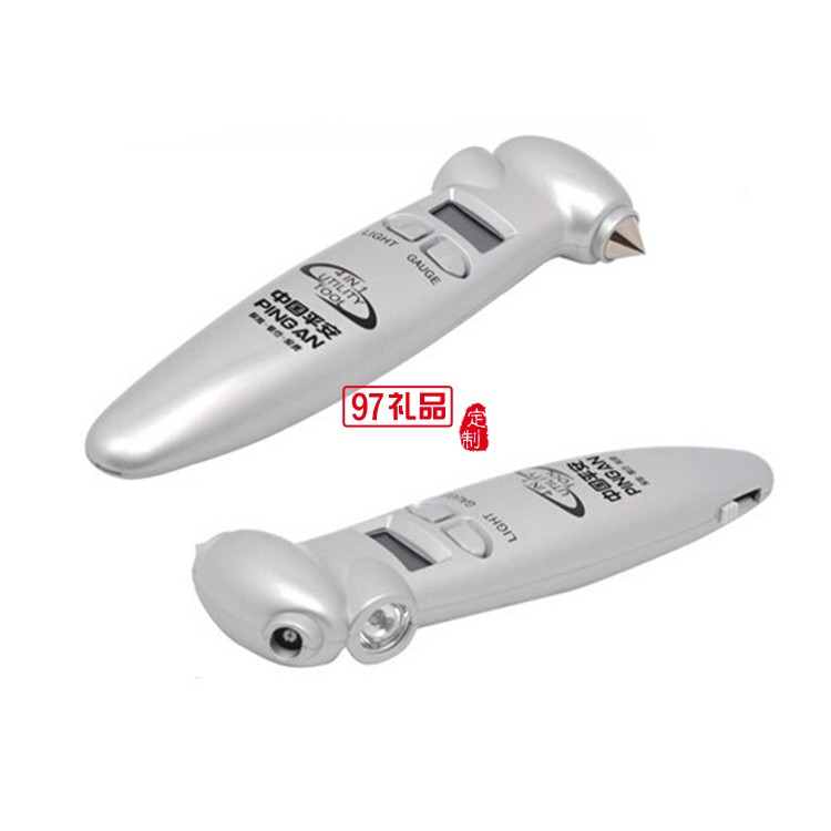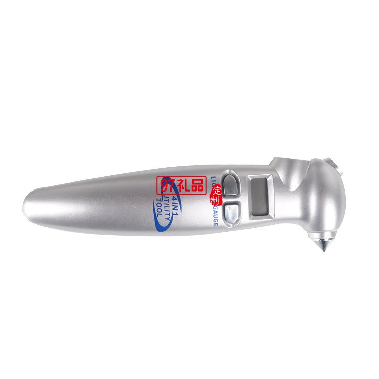 四合一 工具,時尚外形 安全刀,安全錘,手電筒,胎壓計 進口芯片,高精度±1PSI,準確測量輪胎壓力 四個單位:PSI、Kpa、Bar、Kg/cm2 全世界通用 正確的輪胎壓力,可以減少汽車損耗,節省輪胎,減少油耗,防止爆胎,確保行車安全