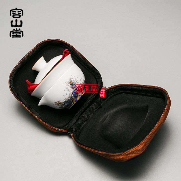 琺瑯彩繪白瓷旅行茶具套裝一壺兩杯公道杯