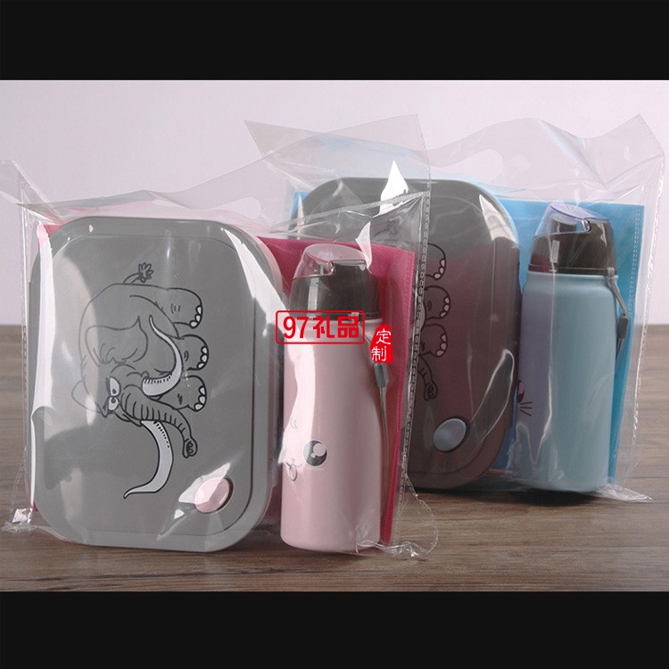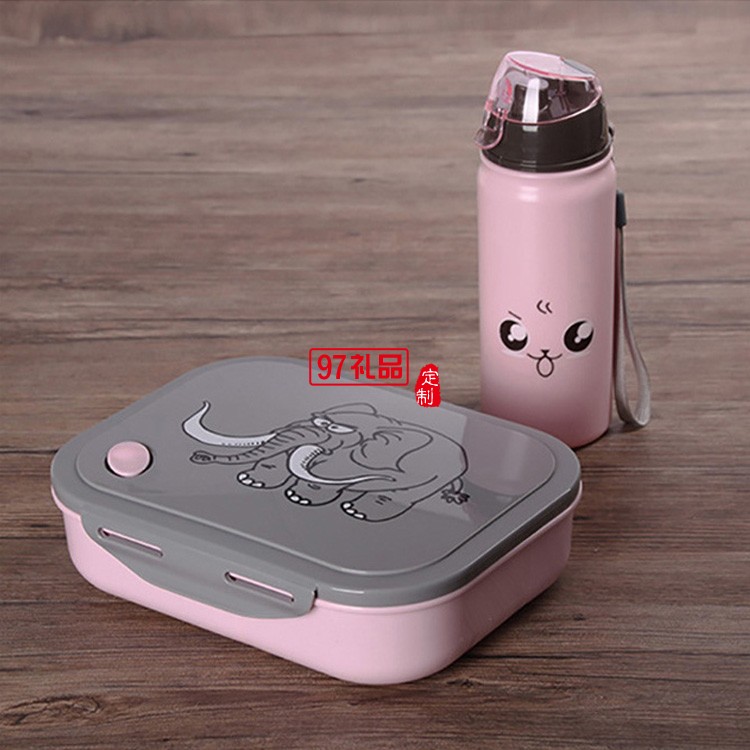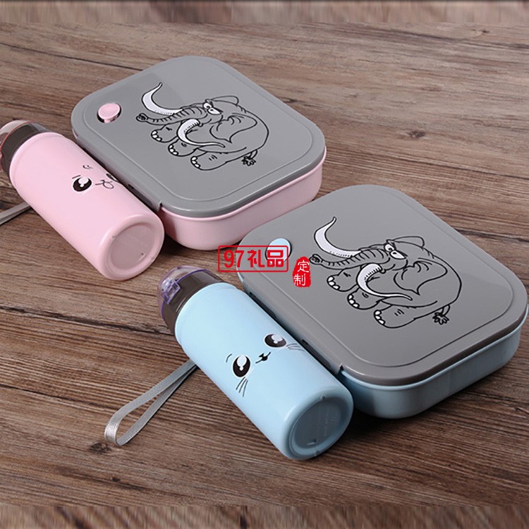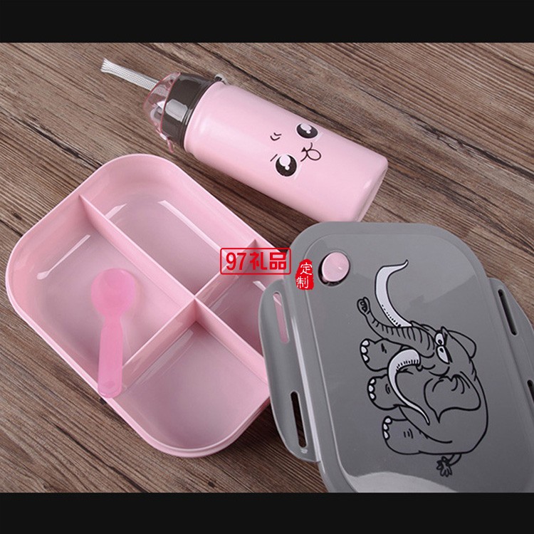 塑料學生長方形分格飯盒帶400ml水壺套裝 卡通套裝飯盒帶手提袋