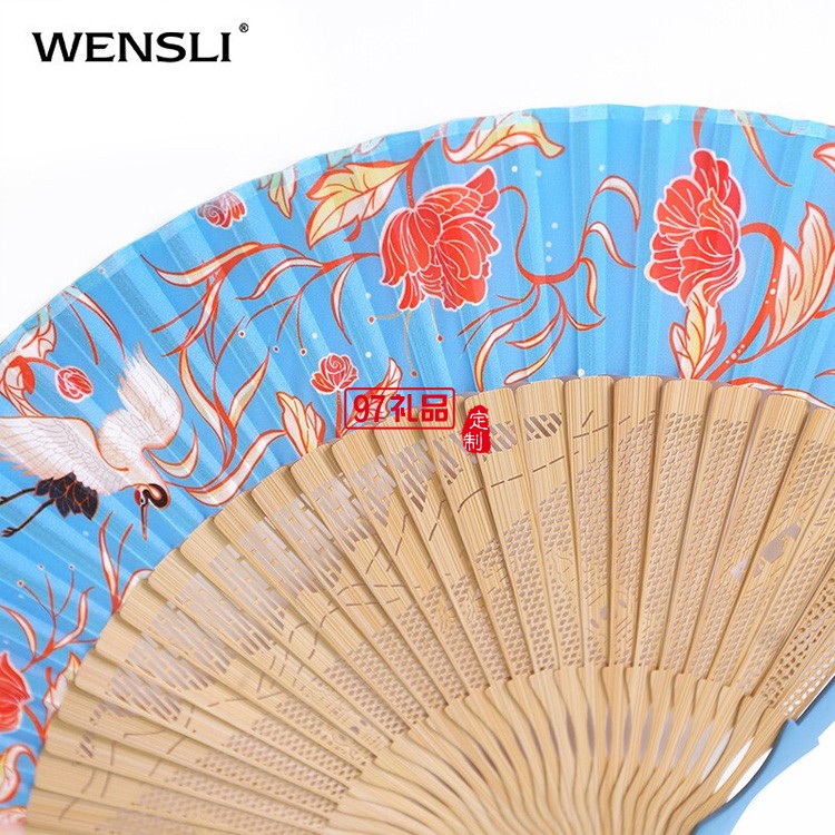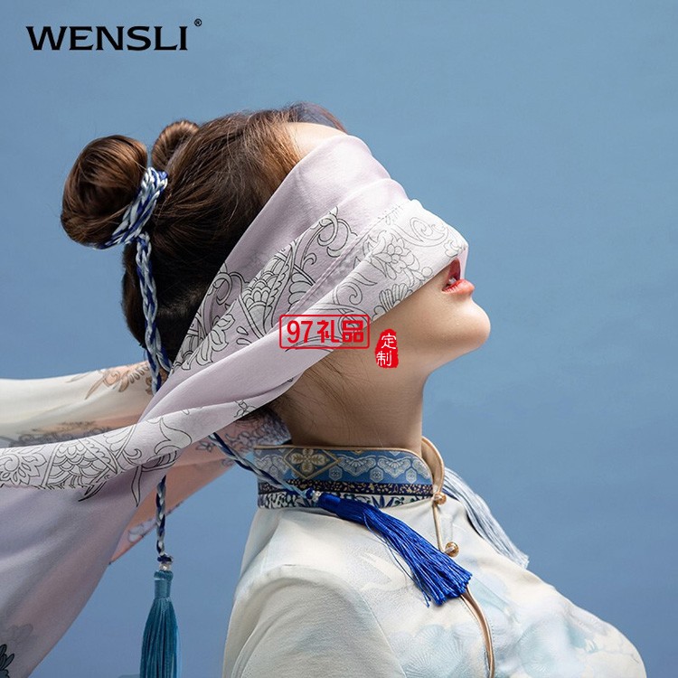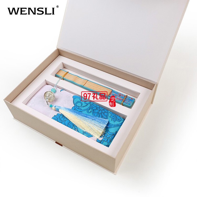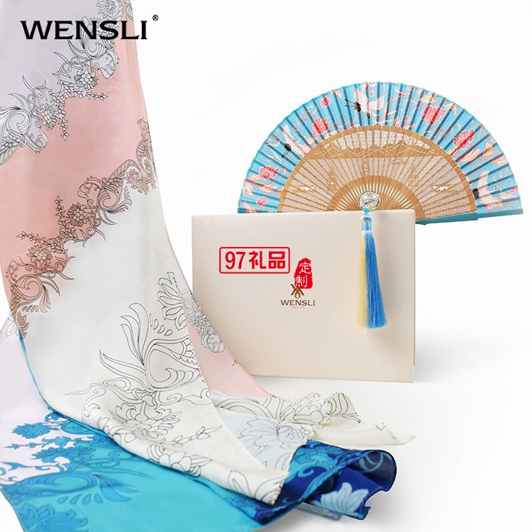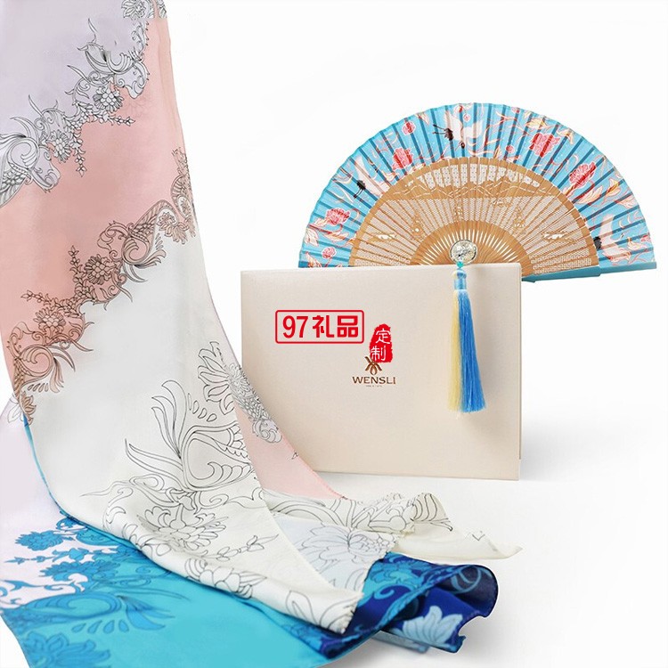 桑蠶絲絲巾真絲長巾杭州絲綢祥瑞絲扇送禮套裝 祥瑞絲扇套裝藍色
