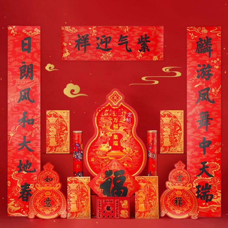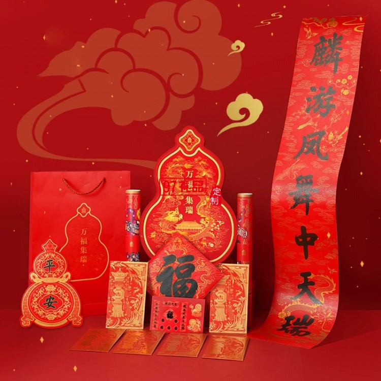 規(guī)格 1套( 春聯(lián)1對(duì):大福字1;橫批1:小福字55;門神一對(duì);冰箱貼1套;紅包*6;福祿春條*4; 窗花*2; 隔條組件1套;無痕點(diǎn)膠60枚: 葫蘆外盒1l; 禮品袋11)