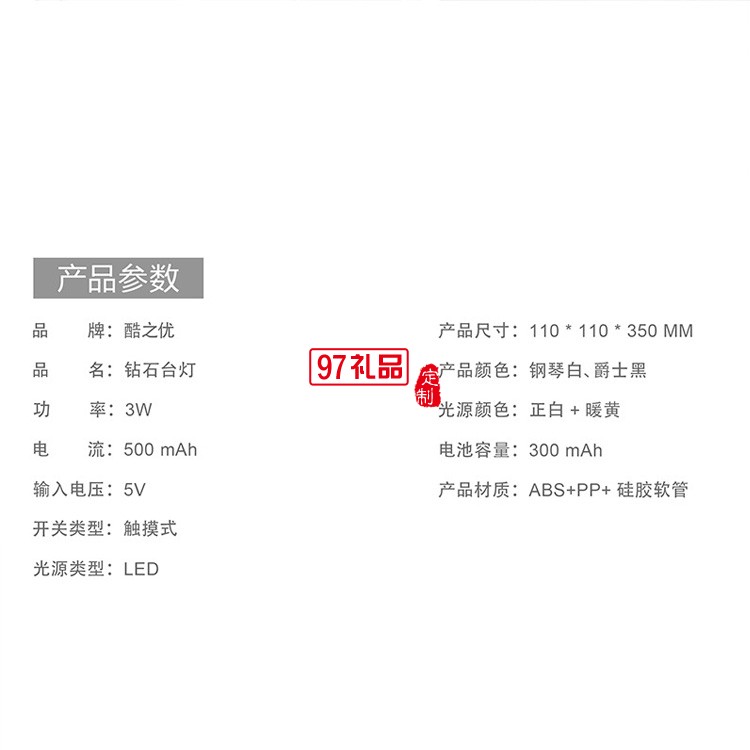 型號鉆石臺燈光源類型led燈電壓5(V)開關類型觸摸式燈罩材質塑料外形尺寸110*110*350(mm)風格現代燈光顏色黑色,白色光源功率3W(W)