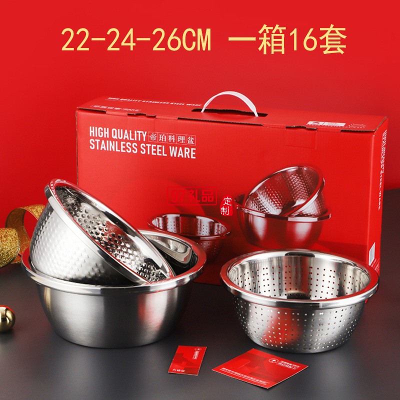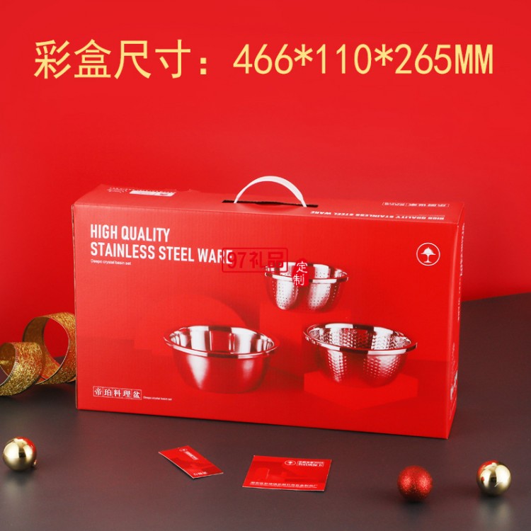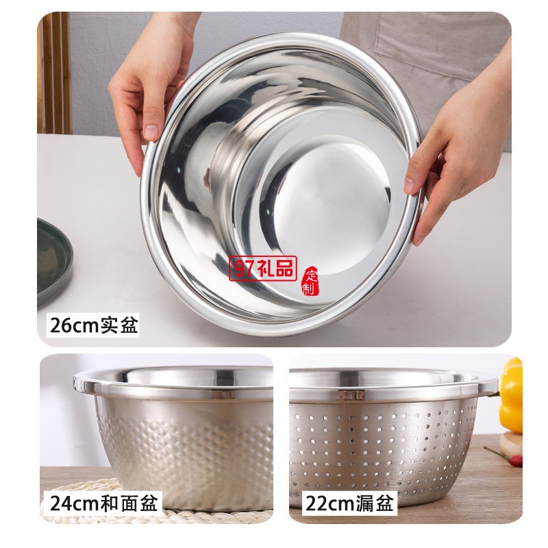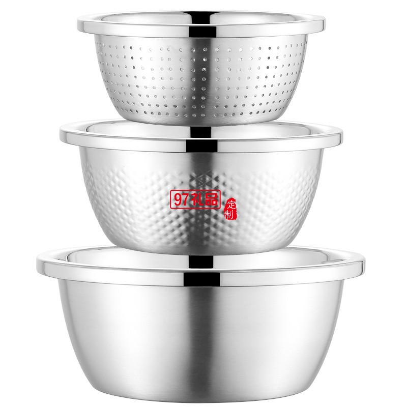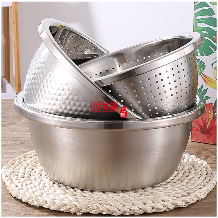 加厚不銹鋼盆米篩三件套調(diào)料缸淘米盆洗菜盆實(shí)用年貨禮品套裝盆子