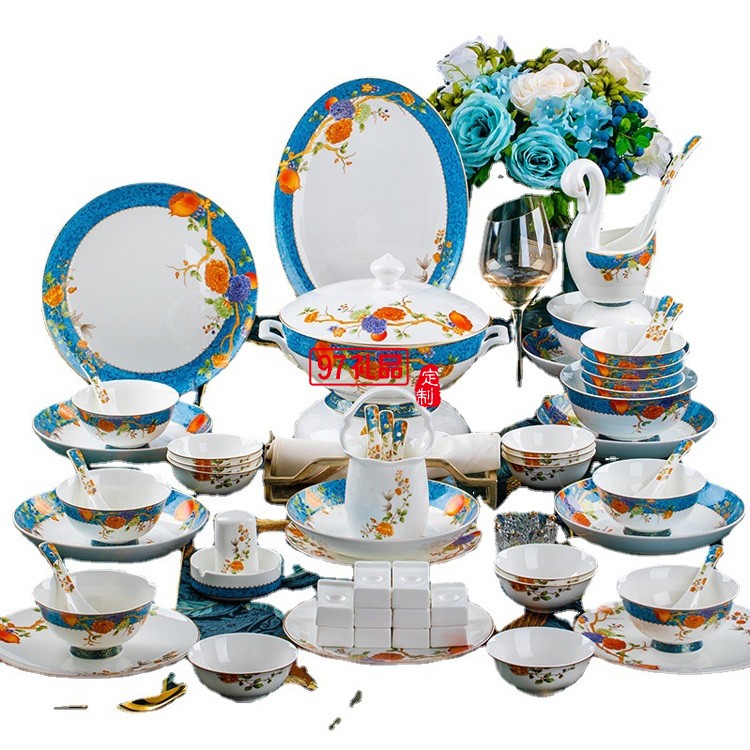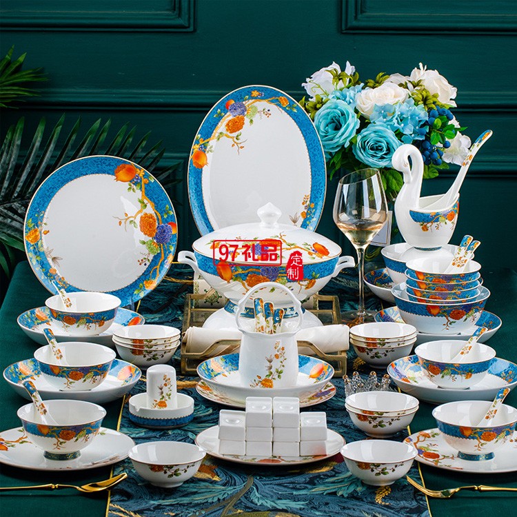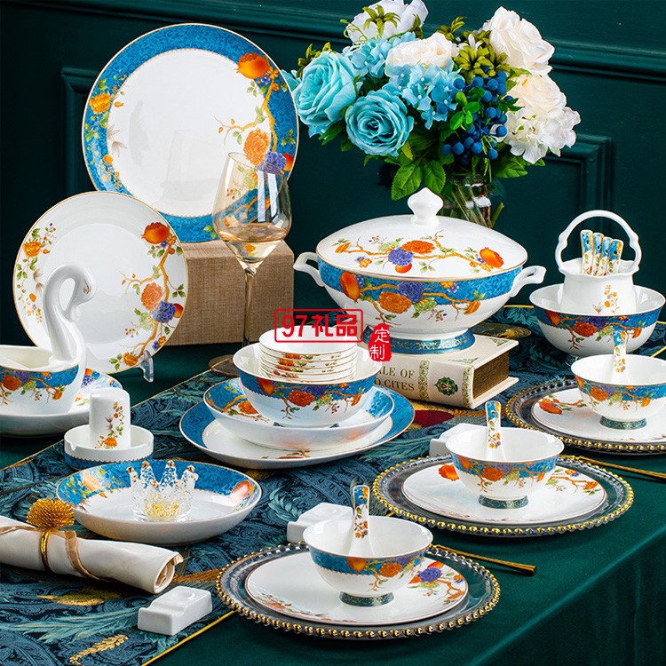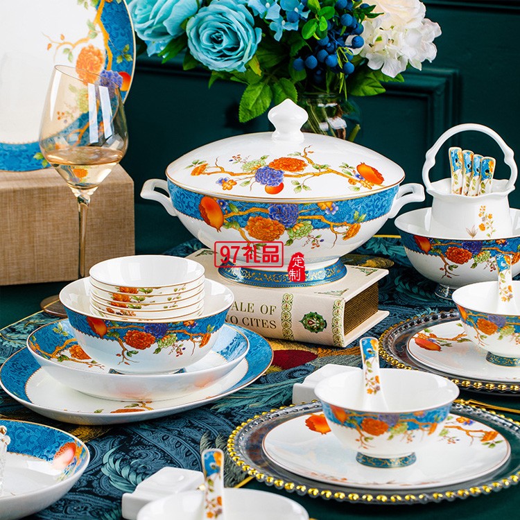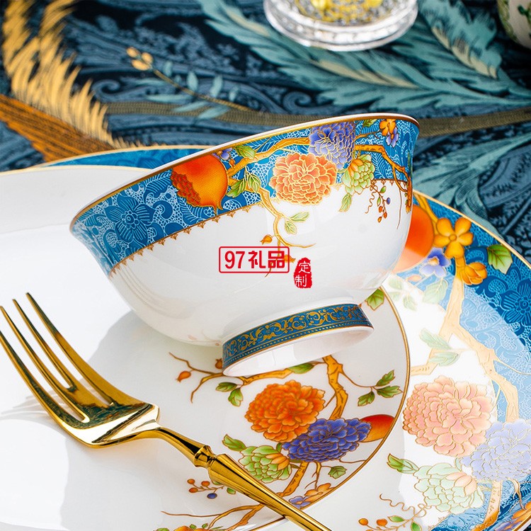 景德鎮(zhèn)陶瓷餐具富貴石榴家用歐式金邊骨瓷碗碟套裝碗盤子