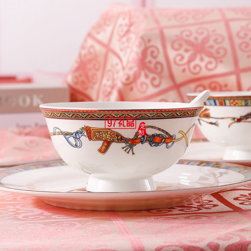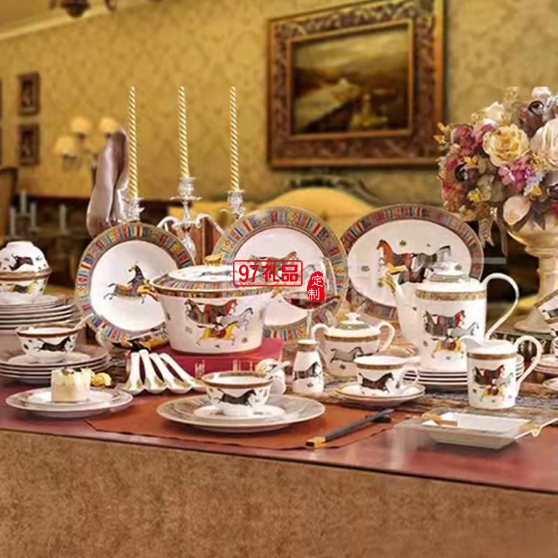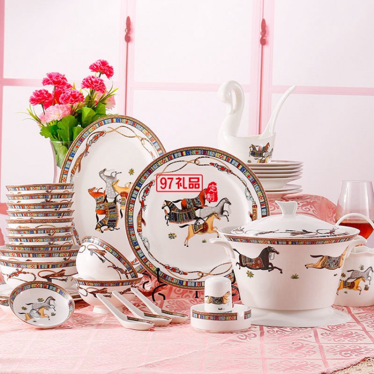 HERME愛馬60頭餐具套裝禮盒碗盤碟景德鎮骨瓷釉中彩陶瓷喬遷結婚