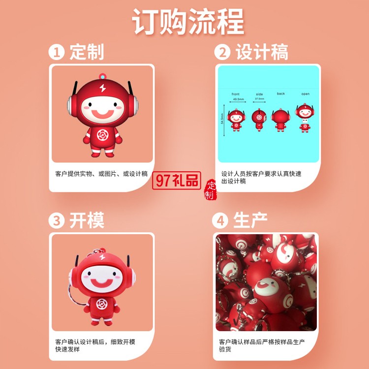 定制流程:選中商品提出定制需求,免費(fèi)策劃設(shè)計(jì),確認(rèn)樣品下單, 簽署合同支付定金,支付余額收貨,售后啟動,免費(fèi)熱線:400-0197-908