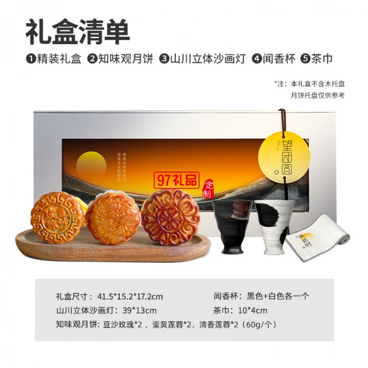 禮盒配置;禮盒*1、月餅*6、山川立體沙畫燈*1、聞香杯*2、