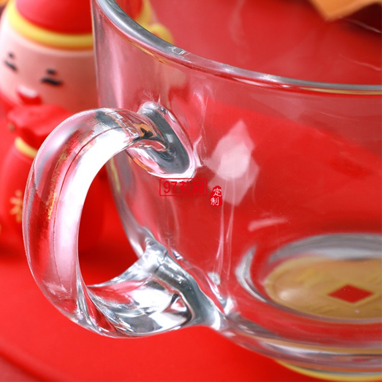 產品特點: 杯子玻璃+PVC杯墊,攪拌勺不銹鋼材質。獨特的財神爺和福袋設計,寓意招財進寶。原創設計,圖案可定制。
