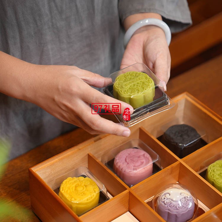 茉莉青提流心×2,  桂花烏龍流心×2,  抹茶青蘋果流心×2 ,紅茶金沙奶黃流心×2, 洛神花蜜果流心×1, 竹制茶點盤×1,  隔板×4,   手提袋×1